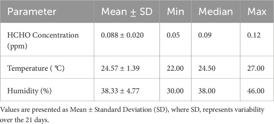 Table 3 presents the descriptive statistics for temperature, humidity, and HCHO concentrations, summarizing the mean, standard deviation (SD), maximum, minimum, and median values over the 21-day continuous measurement period. This statistical breakdown clarifies the variability and trends observed in pollutant concentrations and meteorological conditions.