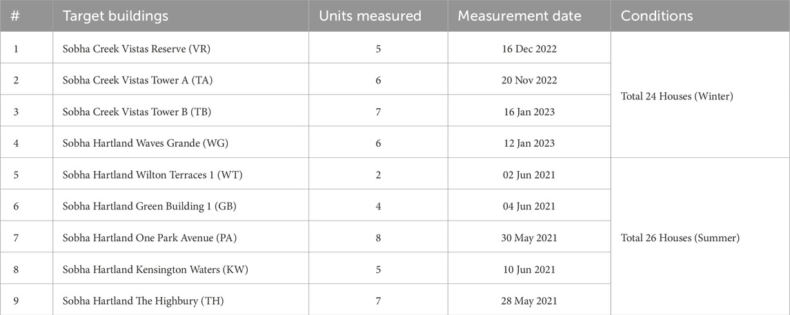 All 50 houses were sourced from various Sobha Hartland and Creek Vistas developments. Choosing a single developer allowed us to maintain consistency in construction materials, building systems, and quality control, reducing variability due to differences in design, finish, or project management (Alonso et al., 2021). This uniformity strengthens the reliability of comparative analysis across different environmental and seasonal conditions.