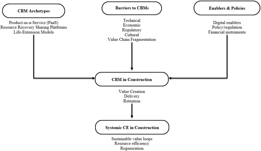 In order to achieve zero-carbon buildings and support reverse supply chains, scanning technologies and BIM technologies are needed. Components can be reused or refurbished with these tools throughout their lifecycles (De Wolf et al., 2024). To consolidate these insights, Figure 1 presents a conceptual framework positioning CBM archetypes, barriers, and enablers. These interactions drive value creation and retention, ultimately supporting systemic circular economy outcomes such as sustainable value loops, efficiency, and regeneration.