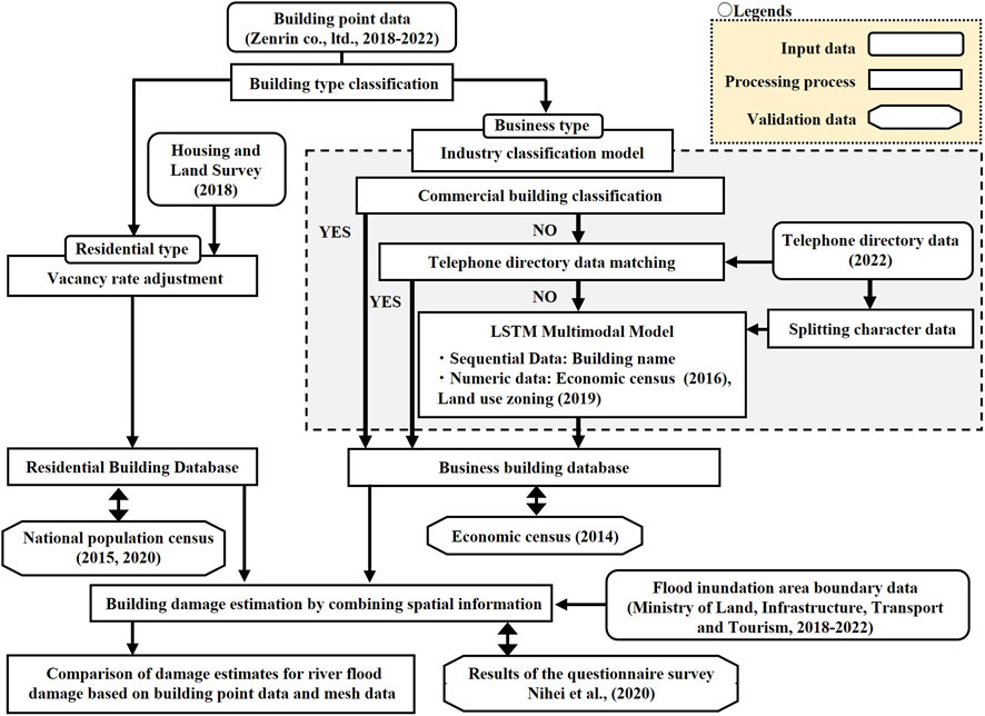 Therefore, the core of this study is to propose a method for efficiently constructing a business establishment database. This involves using publicly available building databases supplemented by telephone directory data to assign detailed industry classifications. Classification prediction is performed through simple matching of telephone directory data and text analysis using LSTMs. Furthermore, recognizing that land use data is effective for estimating building purposes, we construct an integrated multimodal model that also uses spatial information as supplementary data. To the best of the authors’ knowledge, no previous study has applied multimodal classification combining LSTM and spatial information to industrial forecasting. This research contributes to the field by quantitatively evaluating the effectiveness of business statistics and land use zoning in multimodal classification for improving industry prediction results, demonstrating the potential utility of spatial information for industrial classification forecasting. Furthermore, this study estimates the error range between damage estimates based on historical cases using this database and estimates using the conventional 500 m grid as a 100% benchmark, and compares this with the impact of multimodal classification on industrial prediction errors. Thus, this study emphasizes the importance of utilizing detailed point-level building data. The workflow developed in this study enables the construction of a building database containing industry information with significantly less effort than interview surveys, and allows for annual data updates. This is expected to reduce the loss gap in past flood damage estimation and future loss prediction compared to grid-based estimation, thereby appropriately supporting flood damage estimation.