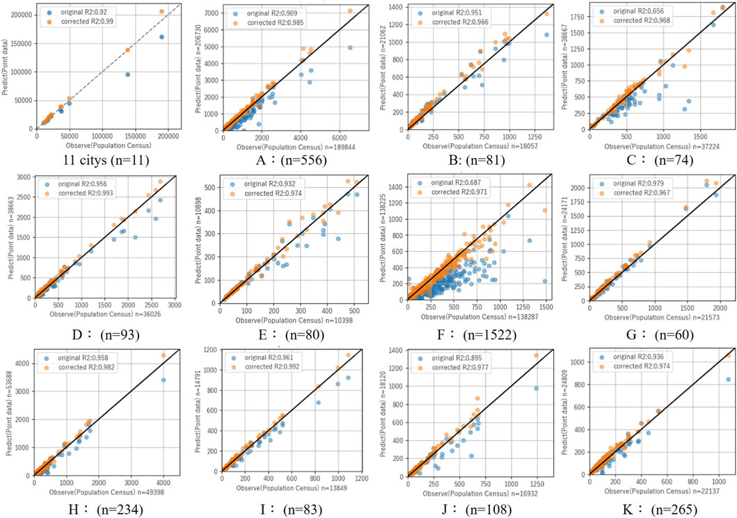 As a result of the correction, R2 values increased to between 0.957 and 0.989 in all the regions. In Region C, where the fit improved the most, R2 increased from 0.656 before correction to 0.957 after correction. This suggested that it was feasible to accurately estimate the number of households using building point data.