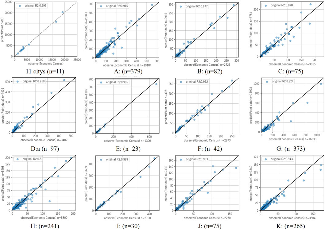 Figure 4 shows the results of comparing the number of establishments based on the establishment statistics (Ministry of Internal Affairs and Communications, 2014) and building point data, aggregated by administrative division, for the 11 regions. The R2 values were evaluated to be high, ranging from 0.800 to 0.995 for all the regions, indicating that the establishment distribution was accurately captured.