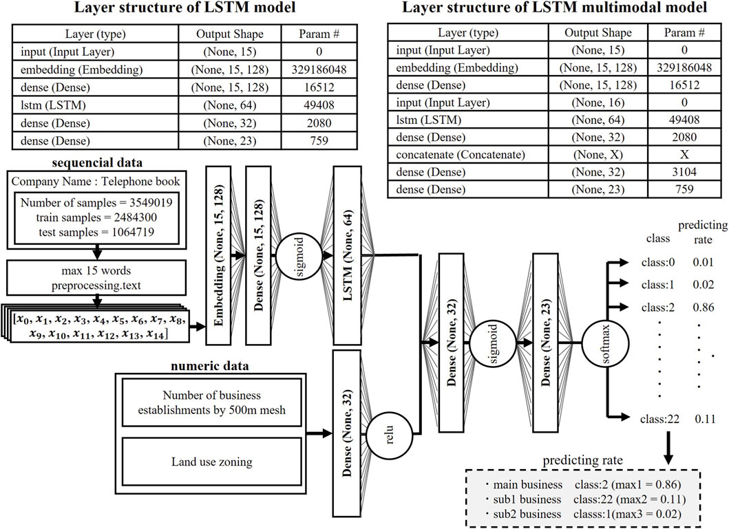 Since the company names in the telephone directory data are in Japanese, morphological analysis was required as a pre-processing step. The Python library, Janome, was used to perform morphological analysis, breaking down company names into common words and proper nouns. These decomposed words were converted into numerical data using Keras’ keras. Preprocessing.text function, which served as the initial input for the industry classification model. Additionally, to implement a multimodal model based on building name analysis, we incorporated spatial information. This included the ratio of establishments by industry within a 500 m grid data from the Establishment Statistics (Ministry of Internal Affairs and Communications, 2016) and the land use zoning based on the City Planning Act (Ministry of Land, Infrastructure, Transport and Tourism, 2019). These data points were used as input to capture the spatial context of each establishment’s location.