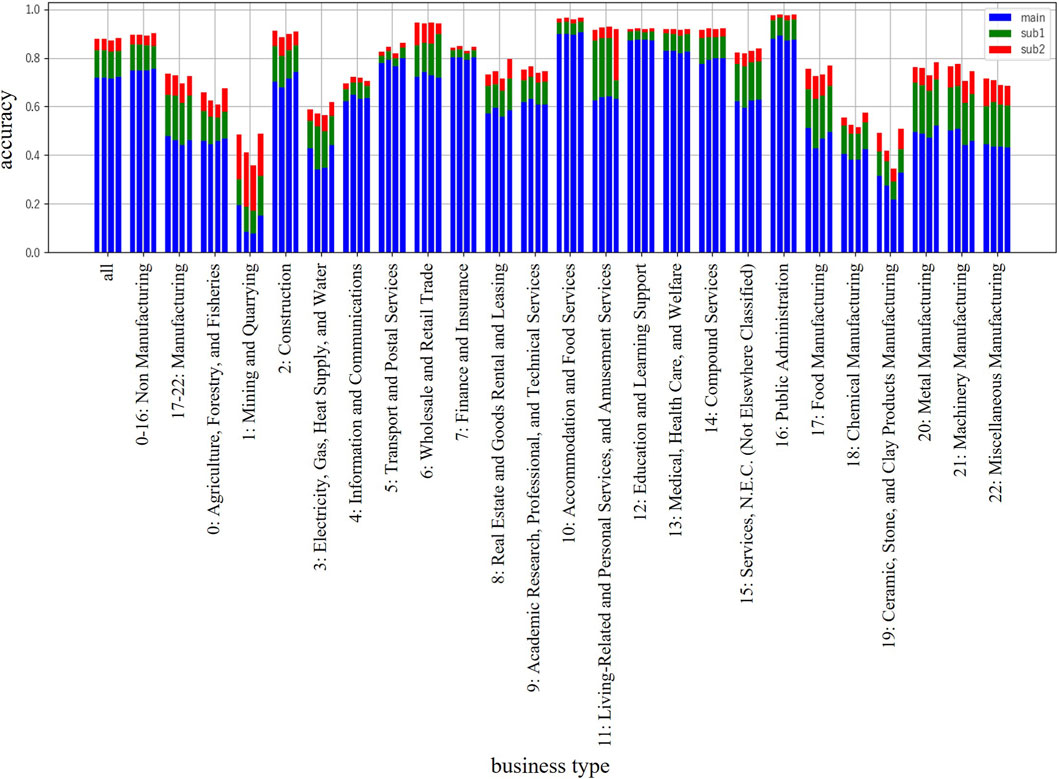 Model training was conducted on 3,549,019 business establishment data items, with duplicate company names removed from the telephone directory data. In this case, the sampling method warrants consideration. However, Maki et al. (2023) found that using nationwide data yielded approximately 82% accuracy in precision comparisons based on training data sampling methods, whereas training with regional data resulted in approximately 78% accuracy. Therefore, we adopted a configuration that uses nationwide data uniformly. The data was divided into training and validation sets, with 70% allocated for training and 30% for validation. The data was classified into 23 industry categories. During classification, the softmax function was used to predict the probability of each data item belonging to each class. This function returned the probability