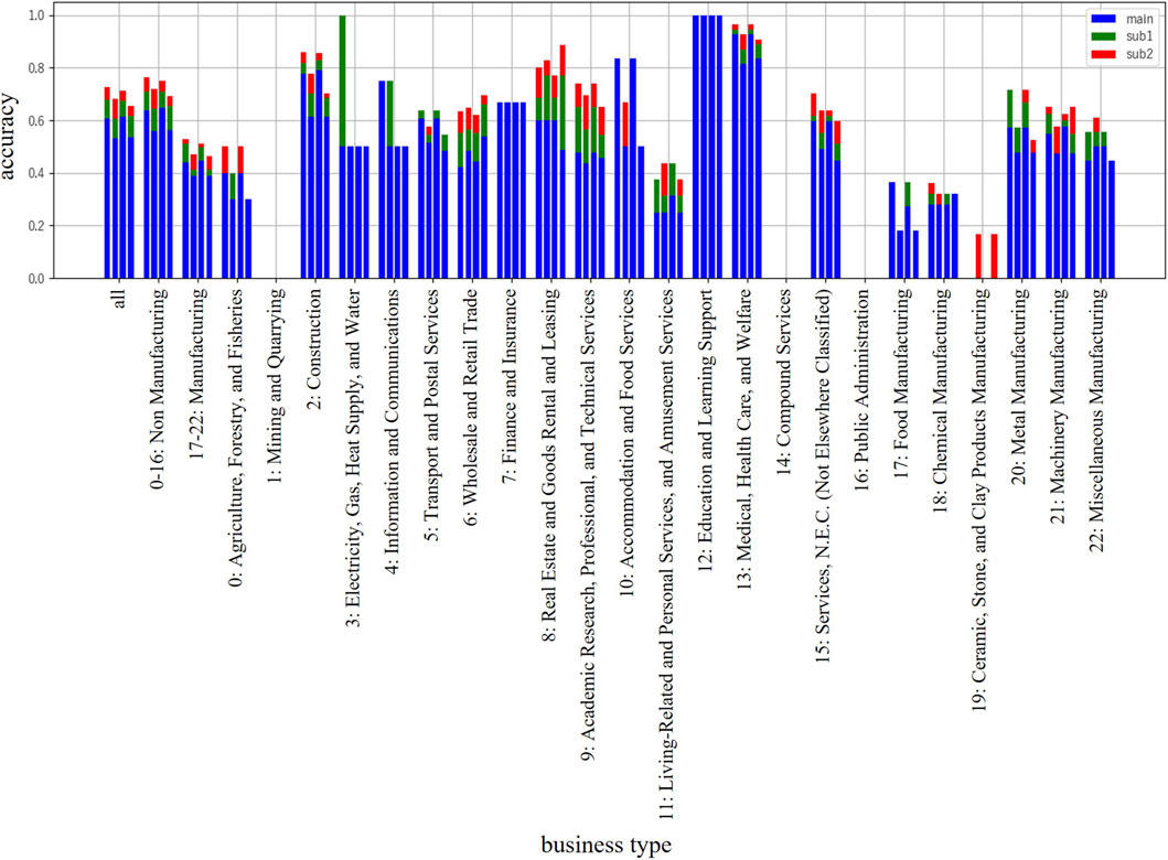 As a supplement, a key consideration when using telephone directories as training data is that they are collected assuming daily consumer services and sales. This means specialized industries and small-to-medium-sized businesses may be omitted, while, conversely, duplicates may occur, such as multiple department numbers within the same business. Business duplication can often be resolved through name or address consolidation. However, the potential for overfitting due to uneven distribution of business counts across target industries remains a challenge. Furthermore, the industry classifications used in the telephone directory employ unique names distinct from the Japanese Standard Industrial Classification (JSTIC). Consequently, the classification destination may not always align with business statistics. Here, the industry classifications in the telephone directory are pre-mapped to JSTIC before being used as training data. This correspondence is shown in Supplementary Table A2.