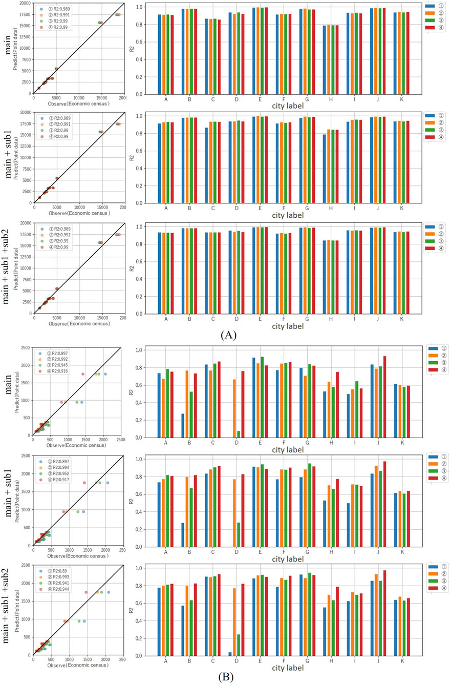 Figure 8. Evaluations of the goodness-of-fit of location distribution based on the industry classification results of each model for the region. (A) by non-manufacturing industries (B) manufacturing industries.