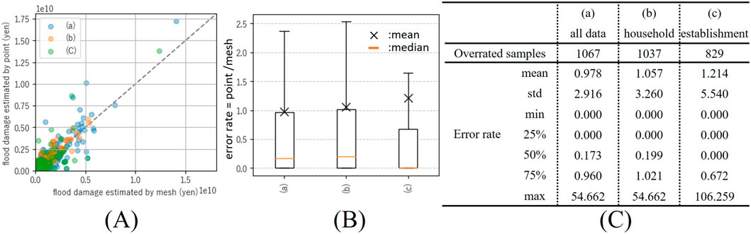 Figure 10. Comparison of damage estimates by 500 m mesh using mesh data and point data. (A) Error plot for each mesh (B) Boxplot of error bars (excluding outliers) (C) Error bar summary.