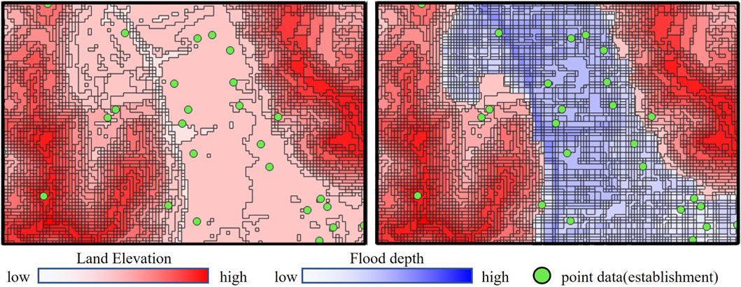 To estimate flood damage using building point data, we compared it with the inundation estimation map (Ministry of Land, Infrastructure, Transport and Tourism, 2018–2022b) published by the Geospatial Information Authority of Japan and calculated the damage using the estimation method outlined in the Manual for Flood Control Economics (Ministry of Internal Affairs and Communications, 2018). For residential damage, the amount of damage to household goods was estimated based on the number of affected households. For business damage, the total damage to depreciable assets and inventory was estimated based on the number of employees in each building. The number of employees used for business damage estimation was derived by aggregating the number of employees by industry in the administrative district where the business building was located and apportioning this based on the total floor area of the building. Damage estimates for each building were evaluated by integrating building coordinates and flood depth maps. The software utilized Python’s geopandas, with the coordinate system set to WGS84.