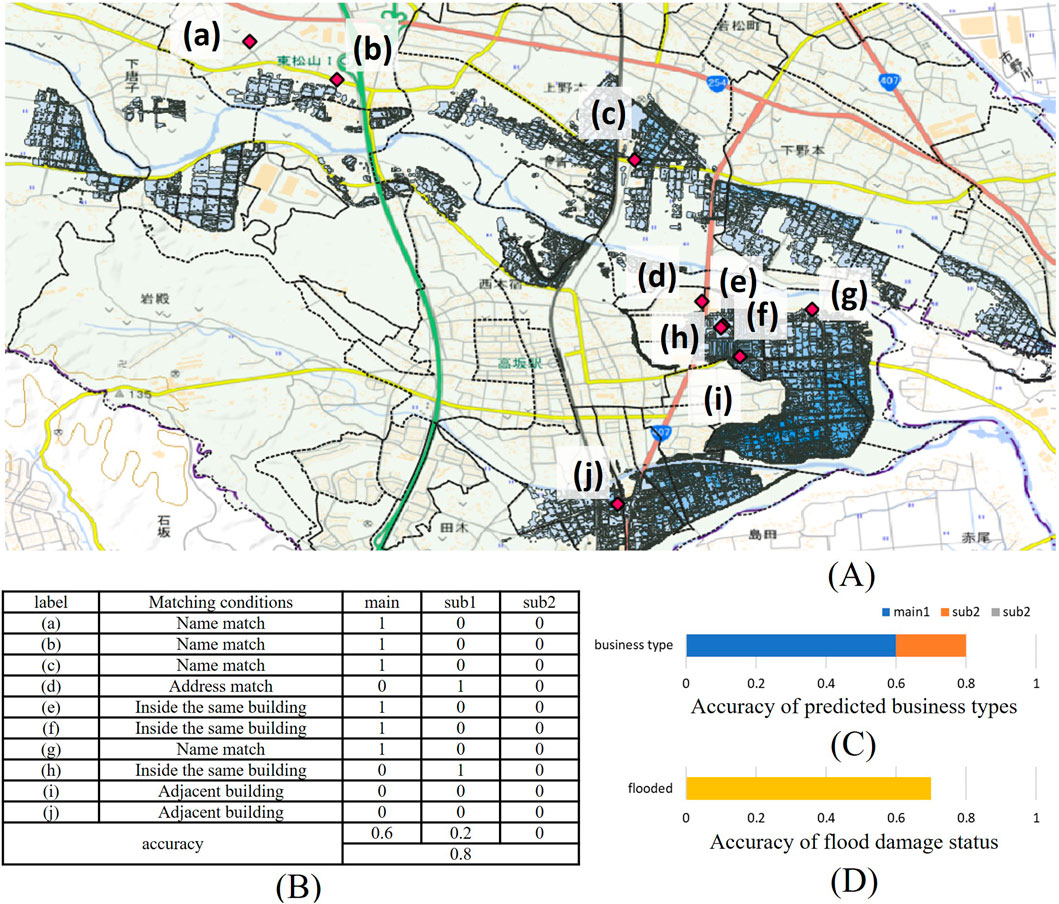 Figure 12. Comparison of industrial damage from questionnaire surveys and predictions (A) Location of affected businesses and flooded area, (B) Matching conditions between point data and surveys and accuracy of industry predictions, (C) Accuracy of predicted business types, (D) Accuracy of flood damage status.