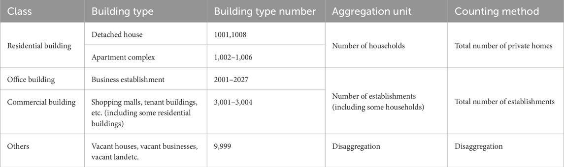 This study utilized building point data (Zenrin Co., Ltd., 2018) as the foundational dataset for the residential and business building database. This dataset included location information and attribute data, such as building name, building area, number of floors, and building classification. Additionally, the data can be accessed at the city, ward, town, or village level, with buildings in the target area provided as individual data points with coordinates. This structure facilitated the aggregation of building attributes across various boundary units.