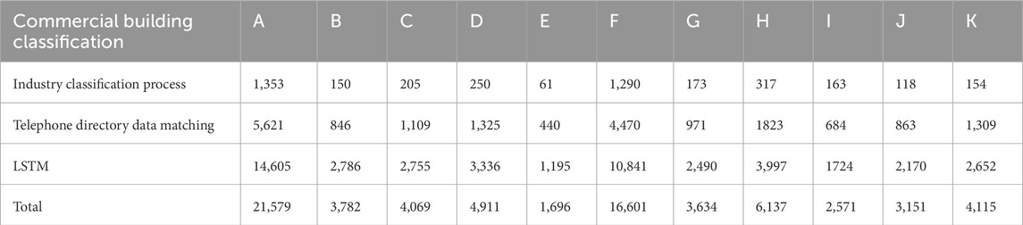 To achieve efficient and highly accurate industry classification for building point data, a rational industry classification process was conducted before applying the LSTM text analysis model. The first step focused on processing commercial facility building data. Identifying the industry from the name of a commercial building is often challenging. Since multiple business establishments can exist within a single building, classifying the industry based solely on the building name is difficult as well. Therefore, the number of business establishments by industry within the building point data was tallied, and the primary and subordinate industries were determined based on the ratio. However, some data lacked the number of business establishments by industry, and these entries were moved to the next processing stage for further handling.