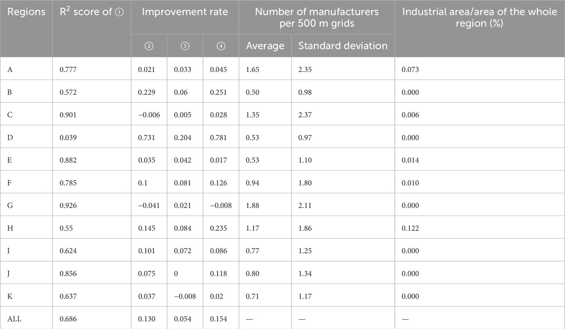 Therefore, to develop a deep learning model enabling more accurate industry classification, we explored the use of data sources related to business establishments. Bhuyan et al. (2022) achieved an F1 score of 74% for estimating building usage by employing cluster analysis based on building shape and supplementing it with open data such as OSM, Google Maps, and land use data. They thus demonstrated that spatial information can improve the classification accuracy of building usage. Furthermore, Teo et al. (2025) and Neffke et al. (2011) point out that industrial location and geographic attributes show a strong correlation. This study examines two spatial information datasets: the number of establishments by industry from business statistics and land use zoning. The Establishment Statistics provide nationwide boundary information for establishment locations and reflect the actual distribution of establishments by industry. Therefore, it is considered to play a supplementary role in guiding prediction results toward aligning with actual conditions. Conversely, land use data consists of boundary information for limited areas designated as urban planning zones. Compared to the Establishment Statistics, its overall effect is considered smaller. However, as this information pertains to zones that systematically regulate the location conditions for each building use, it is considered useful for adjusting prediction results toward specific industries that meet the regulatory conditions within those zones. The zoning information for land use data is shown in Supplementary Table A3. These boundary data exhibit trends similar to the distribution of facilities by building use and are considered highly useful for building use classification prediction. However, there is a concern that using them simultaneously may cause overfitting due to redundancy. This study experimentally clarifies whether these data can function as effective data for industry classification based on diversity classification.