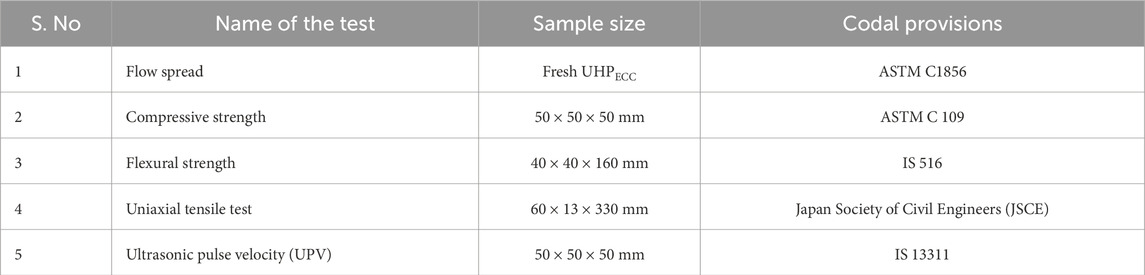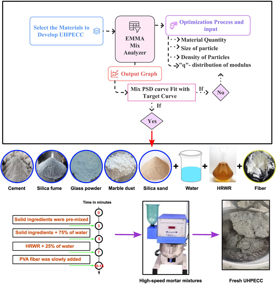 Figure 3 illustrates the optimization process that utilizes the EMMA model, along with the sample preparation procedure. The team prepared the fresh UHPECC using a portable high-speed mixer. Initially, all powders and filler materials underwent premixing for 0–3 min to achieve uniform distribution. Then, 75% of the total water content was added to the mix at medium speed. Next, the HRWR and the remaining 25% of water were incorporated into the mixture, followed by the slow introduction of PVA fibers into the blend. A mini flow table test was conducted to evaluate the rheological properties of the fresh mix by ASTM C1856 [26]. As shown in Table 2, the fresh UHPECC was poured into moulds for the mechanical strength test. Following a 24-h casting period, the specimens were moved to a hot water curing chamber. During the initial preheating stage, the temperature increased gradually over 2 h. The specimens were maintained at 90 °C for 8 h before being returned to room temperature. After this hot water curing process, the specimens remained under standard curing conditions until the testing age (Hiremath and Yaragal, 2017; Shi et al., 2020; Xia et al., 2025).
