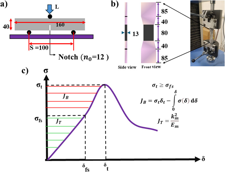 Figure 9. (a) The test setup of the three-point bending test for the specimen. (b) The uniaxial tensile test for the dog bone specimen. (c) Describes the fibre-matrix mechanism.