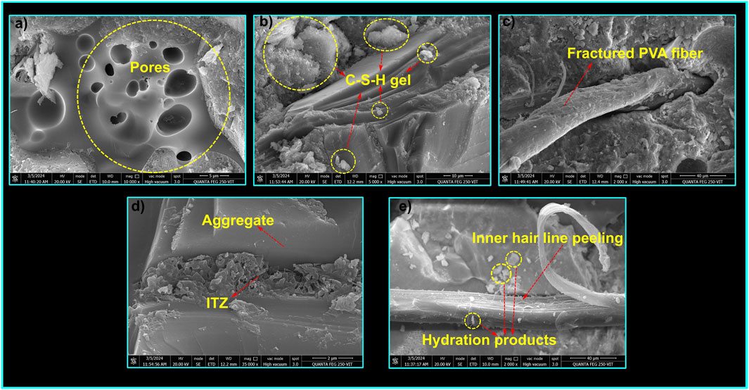 Field Emission Scanning Electron Microscopy (FE-SEM) analysis was conducted to examine the microstructure of the UHPECC matrix and assess the effects of SCMs and PVA fibers, as shown in Figure 11. The FE-SEM analysis enabled the identification of various microstructures, including pores, Calcium-Silicate-Hydrate (C-S-H) phases, the Interfacial Transition Zone (ITZ), and fiber fracture patterns.