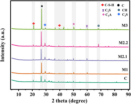 The X-ray Diffraction (XRD) technique was used to identify the phases present in hardened UHPECC. Figure 12 presents the XRD pattern of five hardened UHPECC samples, highlighting the crystalline phases observed, including Calcium Silicate Hydrate (C-S-H), Calcite (C), Tricalcium Silicate (C3S), Calcium Hydroxide (CH), Tricalcium Aluminate (C3A), and Tobermorite. Notably, the peak intensity for unhydrated C3S and C2S particles significantly decreased in mix M3, specifically at 2θ values of 29.310° and 59.15°. The first diffraction peak observed at 20.71° in all samples is attributed to the nucleation effects of CH and silica components. A strong intensity for this peak was especially noted in mixes M2.2 and M3. Additionally, the use of hot water curing in UHPECC accelerated secondary hydration, particularly improving the reaction between the extra silica components from SCMs and the CH present in both the cement and MDP. This subsequent reaction of the C-S-H gel with C2S resulted in the formation of Tobermorite, as confirmed by the characteristic spectral range of 36–49. Furthermore, X-ray fluorescence (XRF) spectroscopy was utilized to determine the clinker phase composition in the UHPECC samples. Table 5 details the quantities of Bogue’s components calculated using Bogue’s equations (Shim et al., 2021). The primary elemental composition identified in UHPECC comprised 54%–58% SiO2, 23%–29% CaO, 4%–6% Al2O3, 2.5%–3% Fe2O3, and 1%–2% K2O, which were consistently observed in all UHPECC samples.