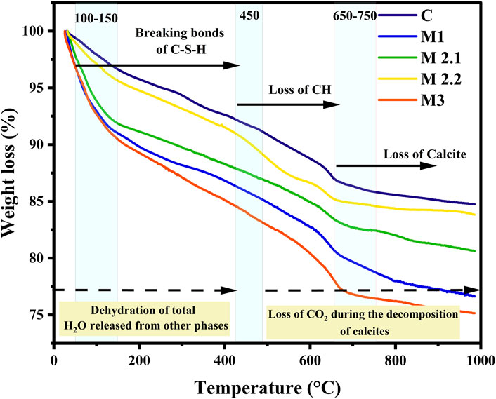 The TG/DSC curves of five samples indicate that the first peak appears within the range of 100 °C–120 °C, corresponding to the elimination of free water molecules and the initial breakdown of the C-S-H gel in the matrix. Among all UHPECC mixes, mix M3 exhibits the strongest peak within this temperature range, suggesting a higher initial mass loss due to the decomposition of C-S-H gel and tobermorite compared to other mixes. In the temperature range of 200 °C–400 °C, calcium hydroxide (CH), calcite, and other hydration products surrounding the binder particles lost their stability. The decomposition of crystalline phases such as CH and calcite begins above 400 °C. The TG/DSC curves indicate that mixes M1, M2.1, and M2.2 exhibit similar peak patterns, whereas mix M3 shows distinct peaks at approximately 450 °C and 750 °C, corresponding to the decomposition of CH and calcite structures. The TG/DSC analysis further confirms that mix M3 resulted in higher initial mass loss than the other mixes, indicating a greater formation of C-S-H gel within the UHPECC matrix. Additionally, the TG/DSC results validate the extent of CO2 capture, as calculated using Equation 12 for all UHPECC specimens and illustrated in Figure 15.