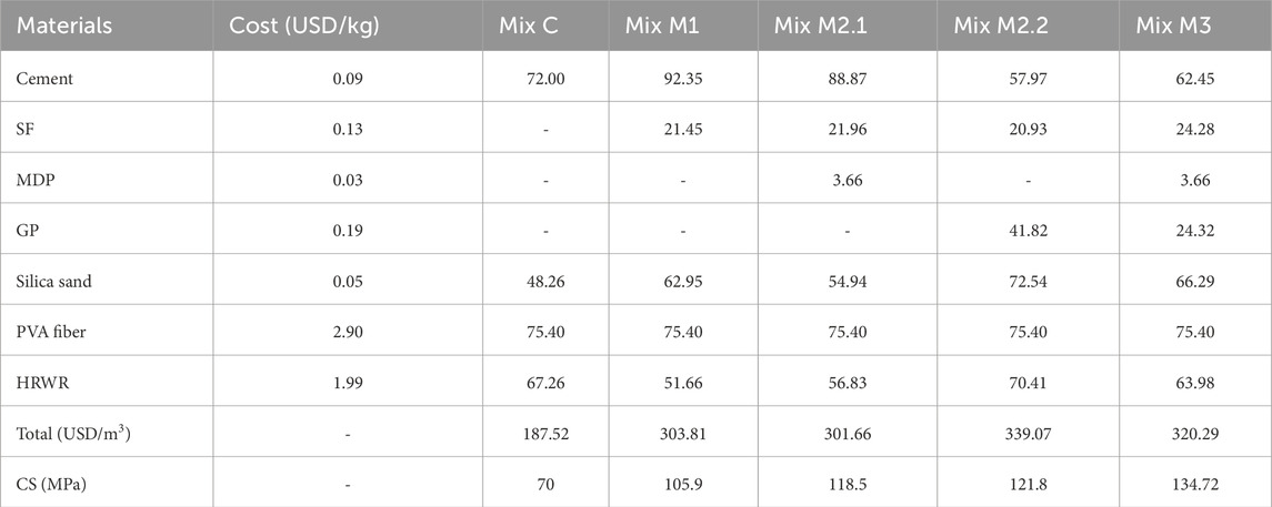 This study successfully develops UHPECC with excellent mechanical strength, strain-hardening capacity, and ductility. However, important to acknowledge certain limitations. One of the primary challenges is achieving uniform fiber dispersion, particularly with synthetic fibers such as PVA. A higher amount of cementitious material with fibers tends to clump during mixing, especially under low w/b ratios, which affects matrix homogeneity and workability. To overcome this issue, gradually increasing the mixing speed helps ensure uniform dispersion of fibers. Additionally, optimizing the mix using the Particle Packing Method (PPM) requires precise control over particle size input and material quantities. Deviation from the target curve can result in either excessive or insufficient binder use, which affects both performance and cost efficiency. We conducted a detailed cost analysis in conjunction with a performance evaluation to assess the economic viability of UHPECC production. The unit costs of each material (in USD/kg) were considered to estimate the total production cost in USD/m3, as summarized in Table 6.