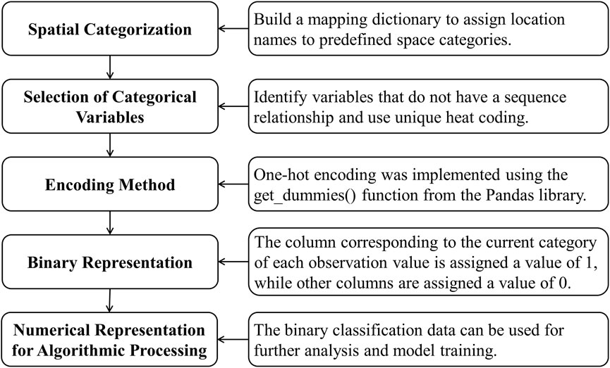 This study involved various spatial categories such as riverfront spaces, public green spaces, and commercial streets. A mapping dictionary was employed to convert location names into the corresponding spatial categories. Additionally, One-Hot Encoding (OHE) was applied to the categorical variables to convert the data into a format suitable for subsequent statistical analysis and machine learning model training (Klimo et al., 2021). The OHE technique transforms each category of a categorical variable into a new binary (0 or 1) column, which is required by most machine learning algorithms because they can process only numerical data (Al-Shehari and Alsowail, 2021). The purpose of OHE is to categorize variables that lack ordinal relationships. However, because behavioral frequency, educational attainment, and monthly income exhibit inherent order, OHE was not applied to these variables.