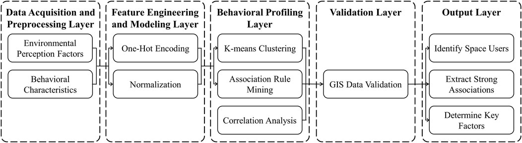 This study developed a multilayered analytical framework integrating multisource data acquisition and machine learning algorithms to systematically identify and quantify key factors influencing public space usage along the Shandong section of the Grand Canal (Figure 5). The framework consists of five layers: Data Acquisition and Preprocessing, Feature Engineering and Modeling, Behavioral Profiling and Preference Mining, Validation, and Output.
