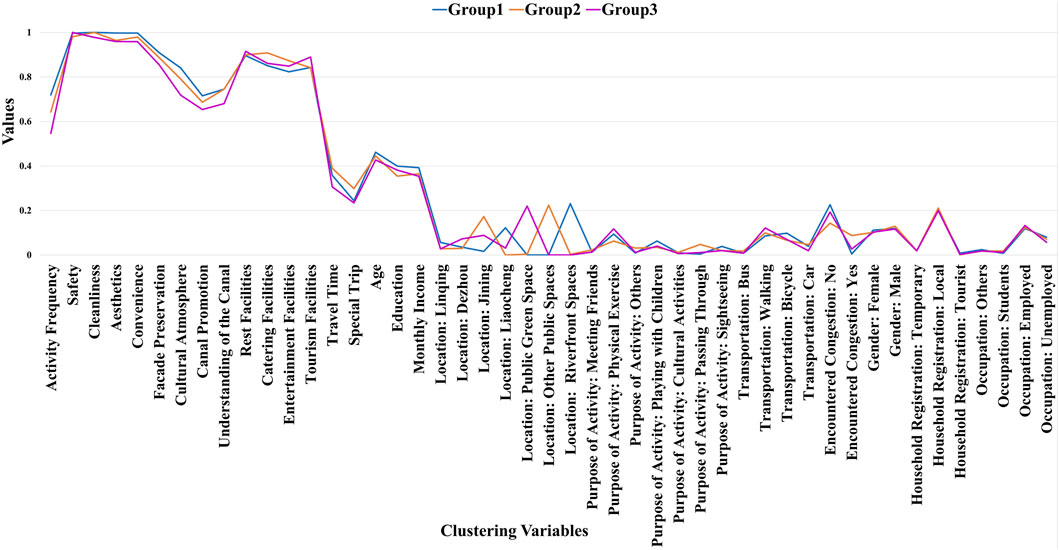 The mean values of the clustering results for the three groups were calculated to determine the cluster centers for each group, which were then plotted as a line chart (Figure 7). The 72% Confidence Intervals for the cluster centroids were obtained via 200-times bootstrap resampling; none of the pairwise intervals overlapped, confirming the statistical distinctiveness of the three visitor groups. This indicated that the results of the cluster analysis were stable. The chart clearly illustrates marked differences in the cluster centers, particularly in the first half of the dataset. These differences are most apparent in the clustering variables such as “Activity Frequency,” “Cleanliness,” “Aesthetics,” “Convenience,” “Cultural Atmosphere,” “Canal Promotion,” “Rest Facilities,” “Catering Facilities,” “Entertainment Facilities,” and “Tourism Facilities.” Additionally, notable distinctions are observed in factors related to behavioral patterns such as walking behavior, and local household registration, further emphasizing the behavioral disparities across the groups.