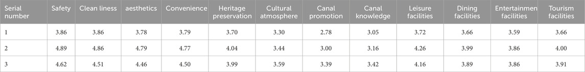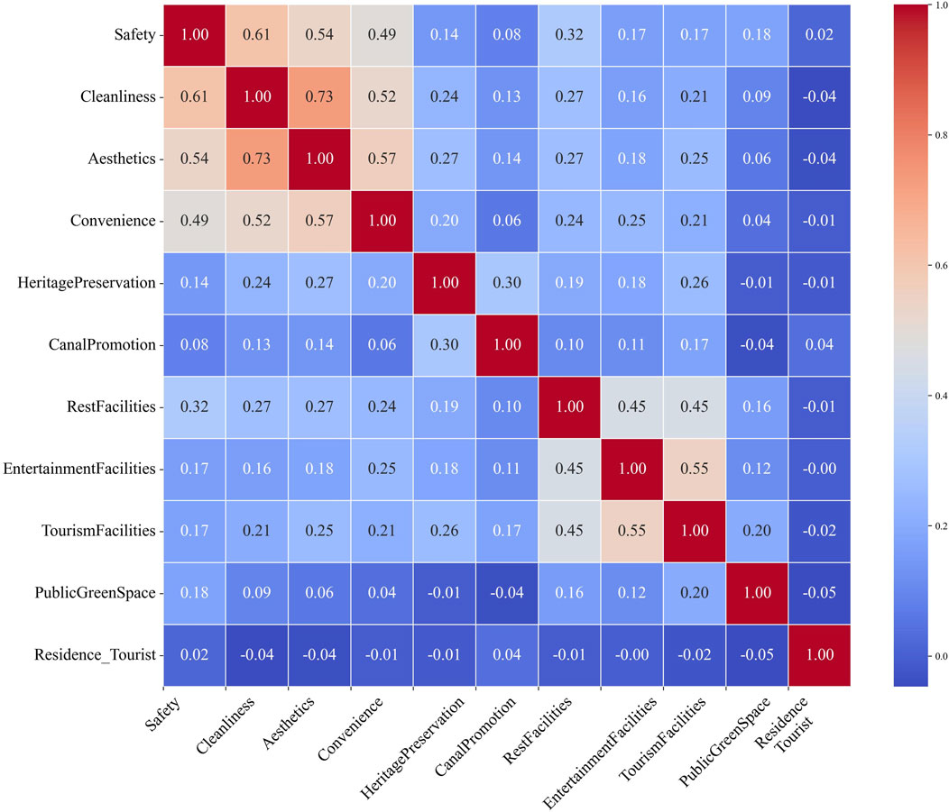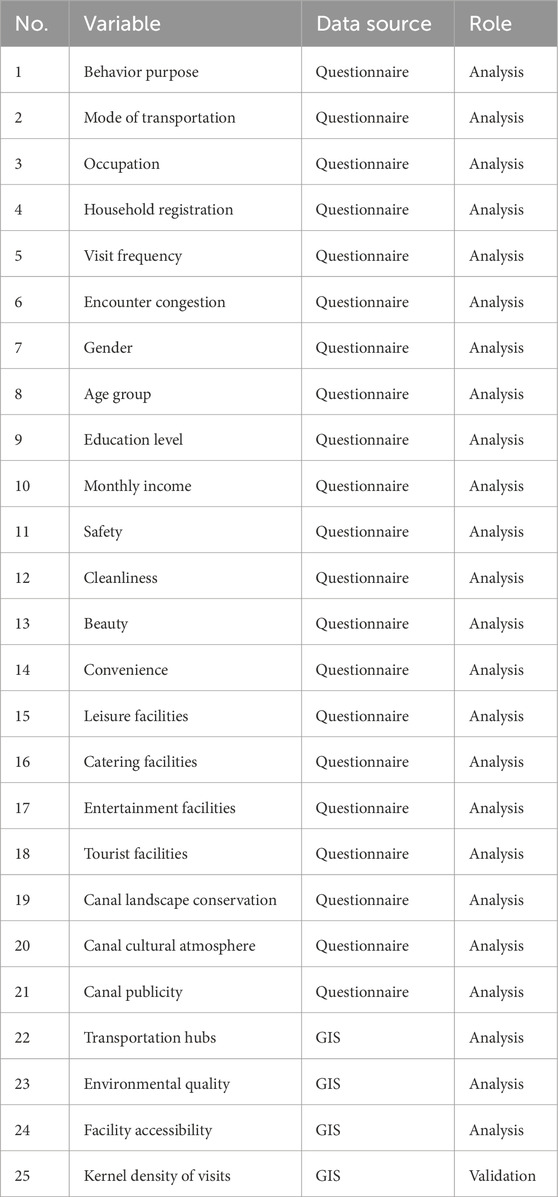 Eleven explanatory variables were identified and categorized into three groups: environmental quality, canal cultural characteristics, and supporting facilities (Joseph et al., 2016). The explanatory or predictor variables used in this research were safety, cleanliness, beauty, convenience, leisure facilities, catering facilities, entertainment facilities, tourist facilities, canal landscape conservation, canal cultural atmosphere, and canal publicity. These variables were chosen following literature review, field observation, and discussion with local experts (Wilson and Kelly, 2011; Cao et al., 2019; Manta et al., 2019).