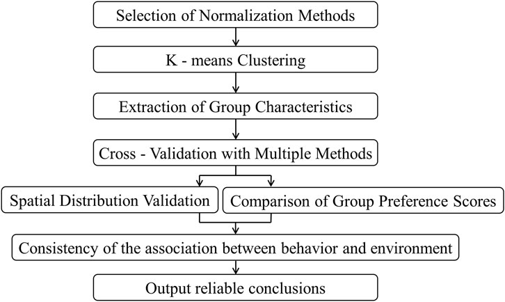 To analyze the data, machine learning techniques were used to identify the patterns of respondents’ behavior and preferences (Yao et al., 2024). To classify respondents into different clusters based on their behaviors and environmental preferences, this study primarily adopted K-means clustering, which is a widely used unsupervised learning algorithm (Sinaga and Yang, 2020). To determine the optimal number of clusters, two common clustering quality assessment methods were used: the Silhouette Score and the Elbow Method. The Silhouette Score is used to evaluate the quality of clustering, with higher values indicating better clustering results (Yu et al., 2020). The Elbow Method calculates the sum of squares error for different numbers of clusters to identify the optimal cluster number (Shi et al., 2021). Additionally, association rule mining was used to explore relationships between different environmental factors and respondents’ preferences. The Apriori algorithm was applied to generate frequent itemset (Bashir, 2020) and association rules (Luo and Miao, 2023) to help uncover notable patterns in the usage of various public spaces.