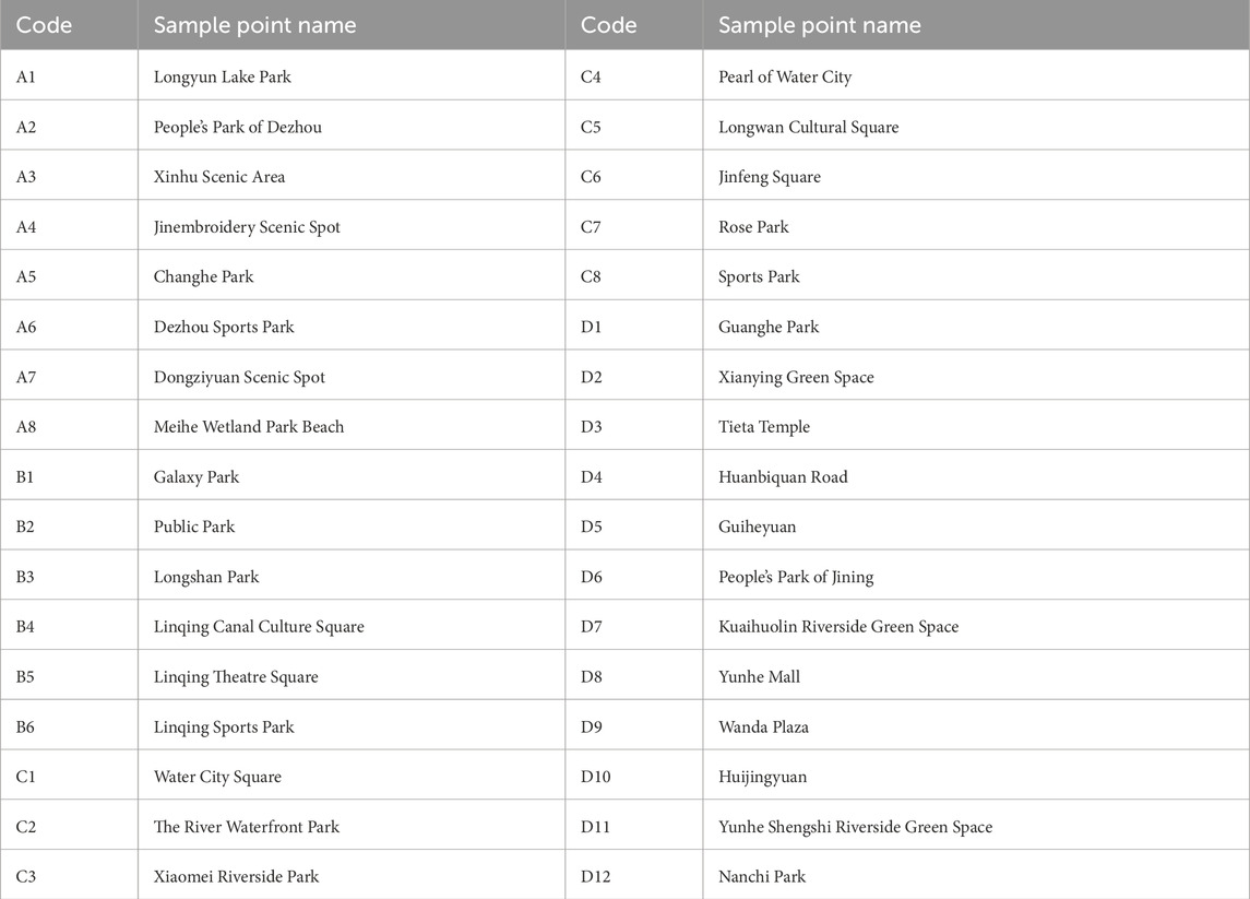 Along the Grand Canal in Shandong Province (China), the central cities of Dezhou, Linqing, Liaocheng, and Jining (Figure 1) are crossed by the canal. Historically, these cities have held relatively high administrative status. Among them, Liaocheng was once the seat of a prefecture, while Dezhou, Linqing, and Jining served as secondary prefectures (Jiang et al., 2022). As listed in Table 1, these locations were selected as research subjects owing to their rich historical heritage, unique urban landscapes, and integration of waterfront public spaces. This study specifically focused on public spaces near the Grand Canal within these four cities, including riverside parks, public green spaces, and commercial districts (Figure 2). The selection criteria for these areas included accessibility, cultural importance, and diversity of urban spatial characteristics (Senik and Uzun, 2022). The research covered both highly urbanized areas and historically important regions, thereby providing a comprehensive context for analysis of the interactions between different urban environments and the preferences of residents.