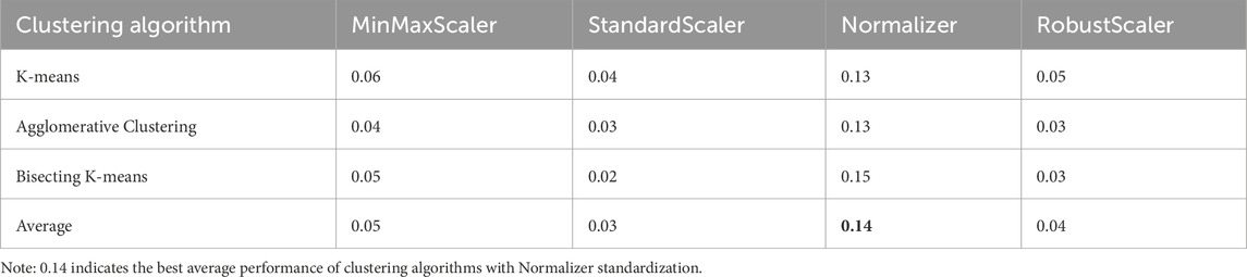 Contour coefficients were used to evaluate the clustering performance of each standardized method. The silhouette coefficient can measure the similarity between data points within a cluster and their dissimilarity from the data points of other clusters. The higher the score, the better the clustering effect. As listed in Table 3, the Normalizer method achieved the highest average silhouette score (0.14) across the K-means, Agglomerative Clustering, and Bisecting K-means algorithms, outperforming MinMaxScaler (0.05), StandardScaler (0.03), and RobustScaler (0.04). The clustering results of the Normalizer method demonstrated the best overall performance under multiple classifications and various clustering algorithms.