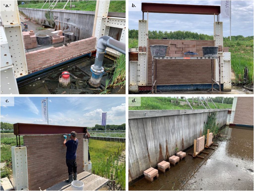 To investigate the behaviour of unreinforced masonry walls under flood conditions, a series of full-scale experiments are planned at the Flood Proof Holland facility. These experiments aim to measure the wall’s out-of-plane deformation and damage progression when subjected to increasing hydrostatic pressures and debris impacts. Additionally, companion material tests were performed to characterise the mechanical properties of the masonry, which were essential for subsequent numerical analyses.