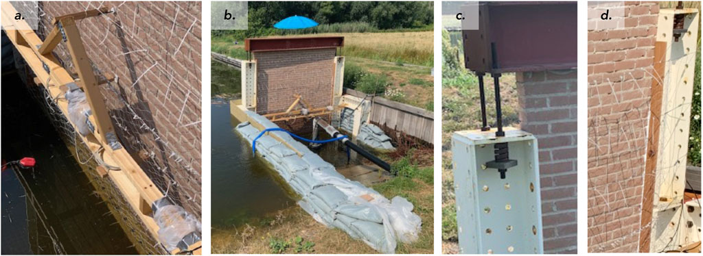 Figure 2. Experimental setup with steel rig, instrumentation, and water control system. (a) Timber support for 3 potentiometers, (b) dike made from sand bags and pump, (c) spring for application of vertical force on the masonry wall, and (d) timber support at the sides.