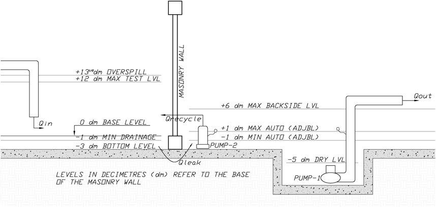It must be emphasised that this test was of pragmatic nature. Rather than simulating hydrostatic pressures with controlled airbags in the laboratory, see for instance Damiola et al. (Jafari et al., 2017), where airbag pressures, wall deformations, boundaries, and displacements can be accurately measured and manipulated, the test was outside, in a basin that could be filled with water. Such a test is inherently less instrumented and less controlled, as water levels cannot be immediately adapted to the behaviour of the wall. The pragmatic aspect and value of the experiment lies in that the masonry is shown to withstand real hydrostatic pressure in as-built conditions.