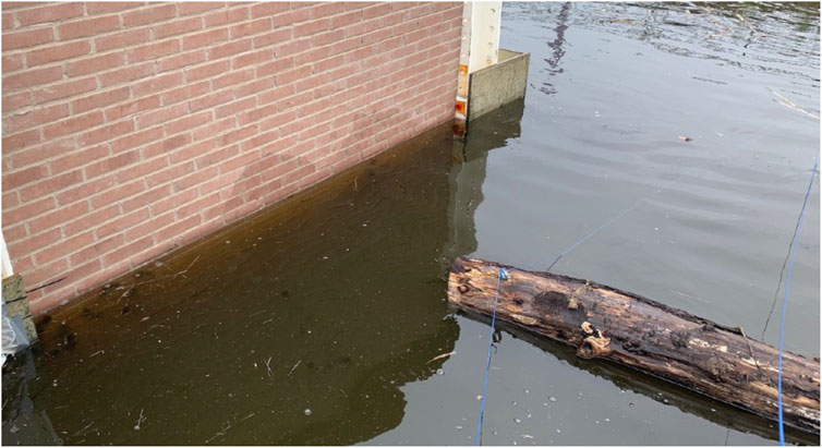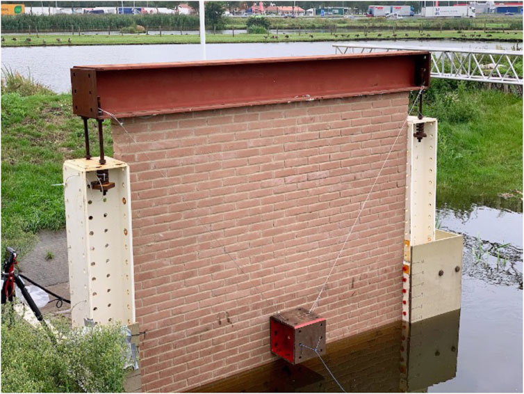 To achieve these objectives, a ×2.7 2.7 m single-wythe masonry wall was constructed and tested under controlled conditions at the Flood Proof Holland facility. The wall was subjected to incremental hydrostatic pressures up to 125 cm water depth, combined with vertical pre-compression to simulate realistic building loads. In addition, debris impact tests were performed using a floating tree log to represent soft debris and a steel cube pendulum to simulate hard debris impacts.