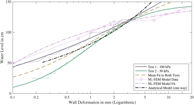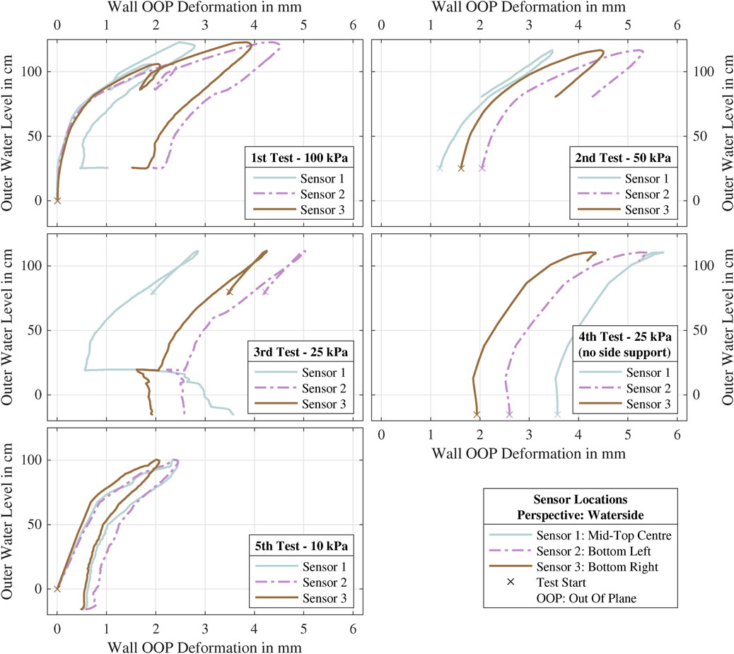 Figure 9 shows the relationship between the outer water level and the wall deformation. During these tests, the inner water level was maintained low as per the schematics of Figure 4. Note that some tests, like Test 3, were started directly following another test. Figure 9 does not show the influence of time; some tests were allowed to drain slowly over the course of several hours; see Table 1.
