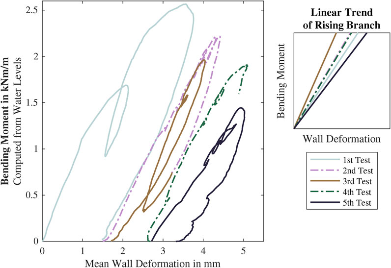 Figure 10. Accumulation of residual deformation across successive tests. Bending-moment against wall deformation. The moment is determined based on the difference between outer and inner water levels which, through hydrostatic pressure, cause out-of-plane bending on the wall.