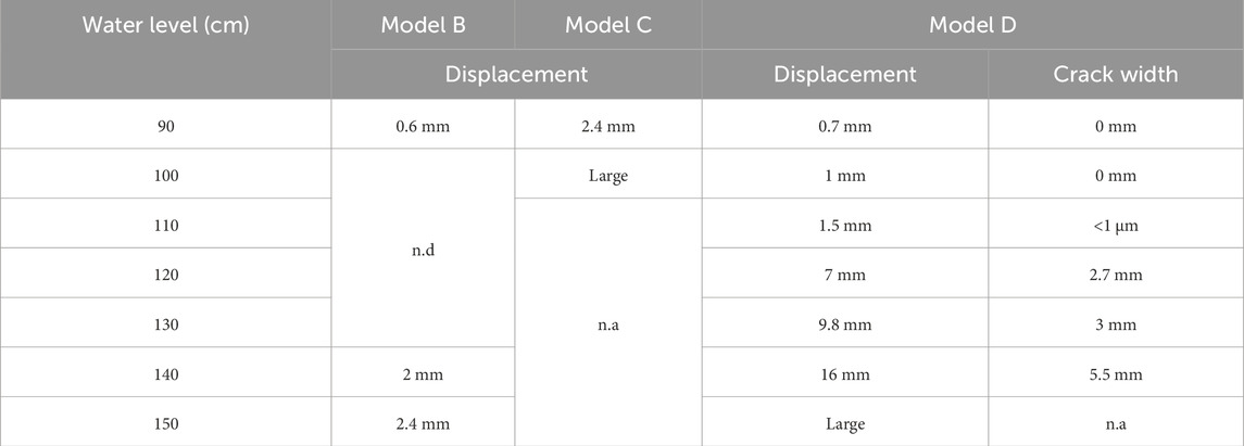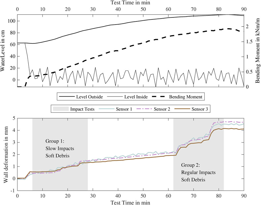 During each test, water was gradually filled in the basin, and the deformation of the wall was continuously measured. To study the effects of sustained loading, water levels were sometimes held constant for several hours or drained slowly (overnight) to observe long-term behaviour.