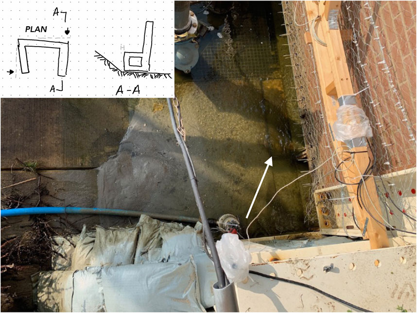 During the experiments, minor water leakage was observed around the wall and the testing rig, despite efforts to minimise it with silicone seals and a plastic-lined sandbag dike (see Figure 13). Over time, water seeped through small gaps between the concrete basin plates, creating a piping effect beneath the rig. This phenomenon caused local erosion of the sand beneath a small concrete tile, which ultimately settled. The additional leakage meant that Pump #2 (see Figure 4) was insufficient to maintain the prescribed water level difference (Qleak > Qrecycle) and Pump #1 had to be activated.