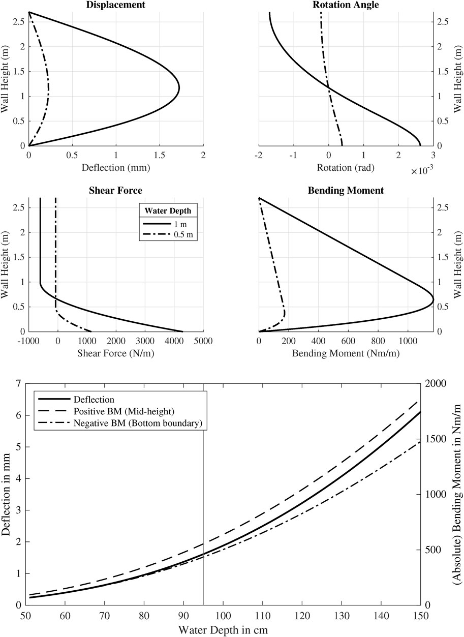 • The wall behaved linearly up to ∼90 cm water depth; cracking and significant non-linear deformation initiated beyond this threshold.