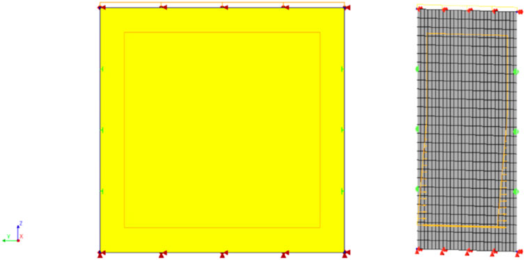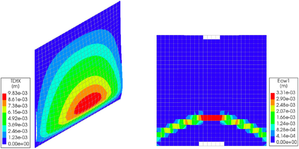 The role of boundary conditions proved critical in the structural response of the wall. Lateral supports in the experimental setup substantially enhanced the wall’s structural capacity through two-way bending and effective stress redistribution after cracking. Numerical simulations confirmed that these lateral constraints significantly delayed failure and reduced overall deformations.