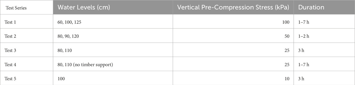 The wall was subjected to incremental water levels to simulate hydrostatic loading conditions. The tests were performed under varying vertical pre-compression stresses to mimic different building load scenarios where load-bearing walls carry the weight of floors, roofs and other walls, as summarised below: