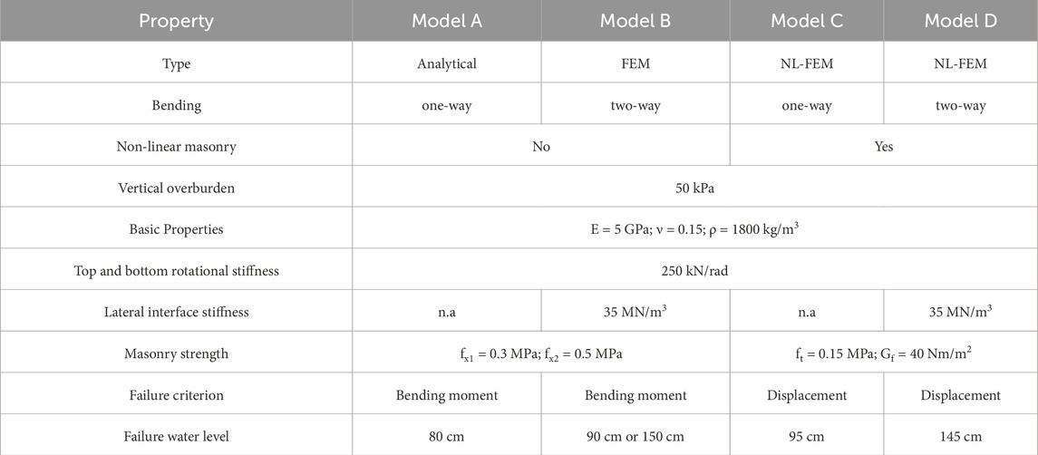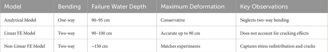 A comparison of modelling approaches revealed varied accuracies and limitations. The analytical model offered conservative predictions, effectively identifying the onset of cracking but lacking the capability to incorporate non-linear effects and force redistribution. The linear elastic finite element model accurately captured responses at lower water depths but failed to adequately represent deformations at higher loads, primarily due to its inability to simulate crack formation. In contrast, the non-linear FEM model accurately reflected the experimental observations, detailing progressive crack development and force redistribution. Although this model predicted ultimate failure mechanisms reliably, it required extensive input parameters, including accurate masonry strength and fracture energy.