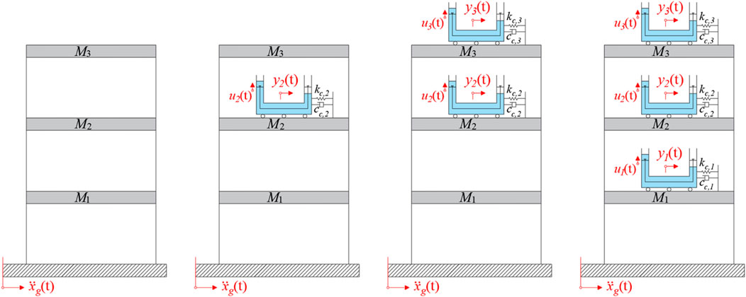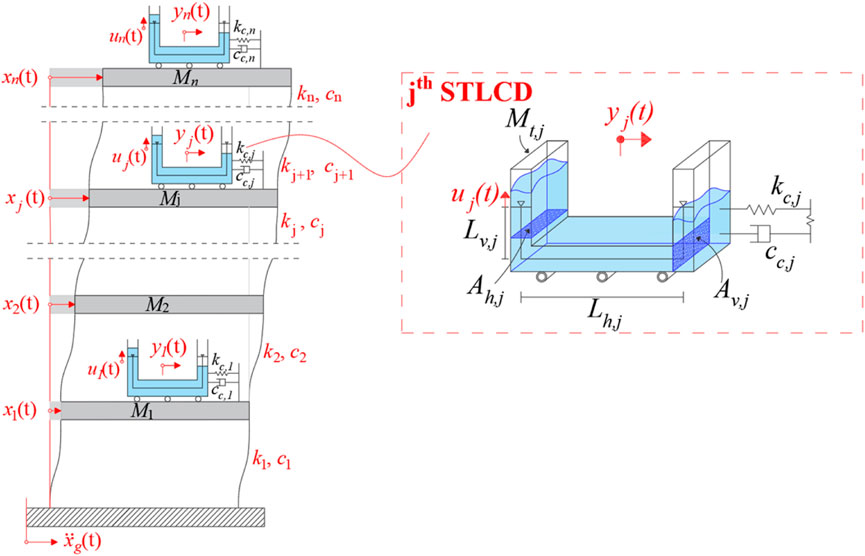 The structure of the paper is organized as follows. Section 2 introduces the mathematical modeling for M-STLCD-controlled n-story structures. Section 3 describes the excitation model used for numerical simulations throughout the paper. In Section 4, some preliminary analyses are presented to investigate the effects of a single STLCD placed on an MDOF structure with respect to the different modes of the structure. The proposed sequential optimization procedure for M-STLCD-controlled n-story structures follows in Section 5. The results of the optimization in terms of device parameters for each iteration as well as the evaluation of the control performance in comparison with common control strategies (M-TMD and M-TLCD), are discussed in Sections 6, 7, focusing on the frequency and time domains, respectively. Finally, conclusions are drawn in Section 8.