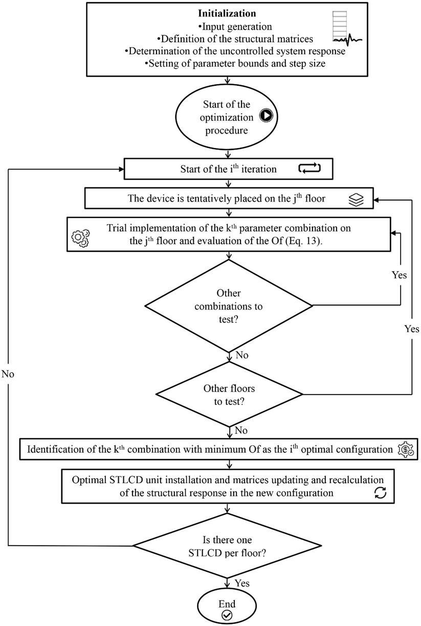 This Section proposes an optimization procedure developed to design the M-STLCD in order to enhance the dynamic performance in n-story structures. Since the M-STLCD is composed of several STLCD units, the goal is to determine the optimal set of parameters and optimal positioning of each device within the structure to achieve an overall reduction in the structural response. Notably, the optimization follows a sequential approach, where STLCD units are installed progressively, one per iteration, ensuring that each unit adapts to the evolving dynamic characteristics of the structure. It is worth emphasizing that, to date, existing literature has not proposed any sequential optimization methodology for the coordinated design and placement of multiple nonlinear STLCD devices across multi-story structures. The proposed optimization strategy installs one STLCD at a time, excluding previously selected floors from subsequent consideration. However, analogously to (Chen and Wu, 2001), a single optimized device can later be interpreted as a set of equivalent dampers distributed across multiple floors in a subsequent phase of the analysis. While the restriction of one device per floor may limit the exploration of more synergistic configurations, such as deploying multiple devices on the same floor, the framework is inherently flexible and can be adapted to support such scenarios if desired.