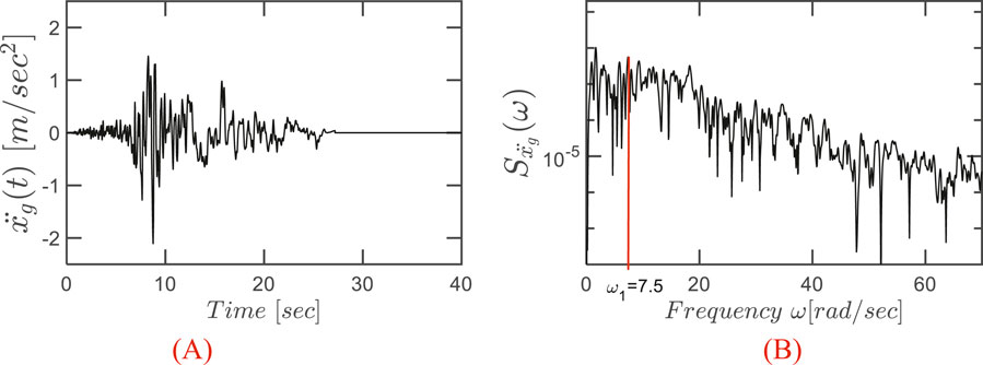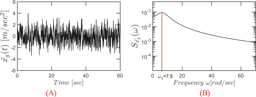 In order to effectively design and optimize the vibration control system, it is essential to accurately characterize the seismic excitation acting on the structure. This section describes the generation of the ground acceleration used as input at the base of the structure and establishes the main response descriptors, which will serve as the basis for the successive sections focusing on both the preliminary analyses on a single STLCD and the subsequent optimization of multiple STLCD devices. In this respect, seismic ground motions are often modeled as stochastic processes to account for their inherently random nature. One of the most widely used representations for characterizing the frequency content of earthquake-induced ground accelerations is the Kanai-Tajimi power spectral density (PSD) function (Chen and Wu, 2001). This widely used formulation accounts for the filtering effects of local soil conditions on seismic waves and is expressed as: