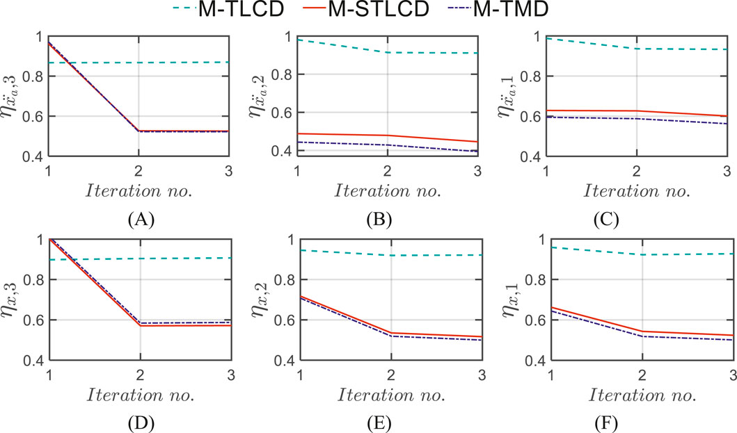 Figure 6. Normalized acceleration variance (top row) at the: (A) 3rd; (B) 2nd; (C) 1st floor, and normalized displacement variance (bottom row) at the: (D) 3rd; (E) 2nd; (F) 1st floor of the three-story structure for each iteration: M-STLCD vs. M-TMD and M-TLCD.