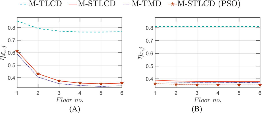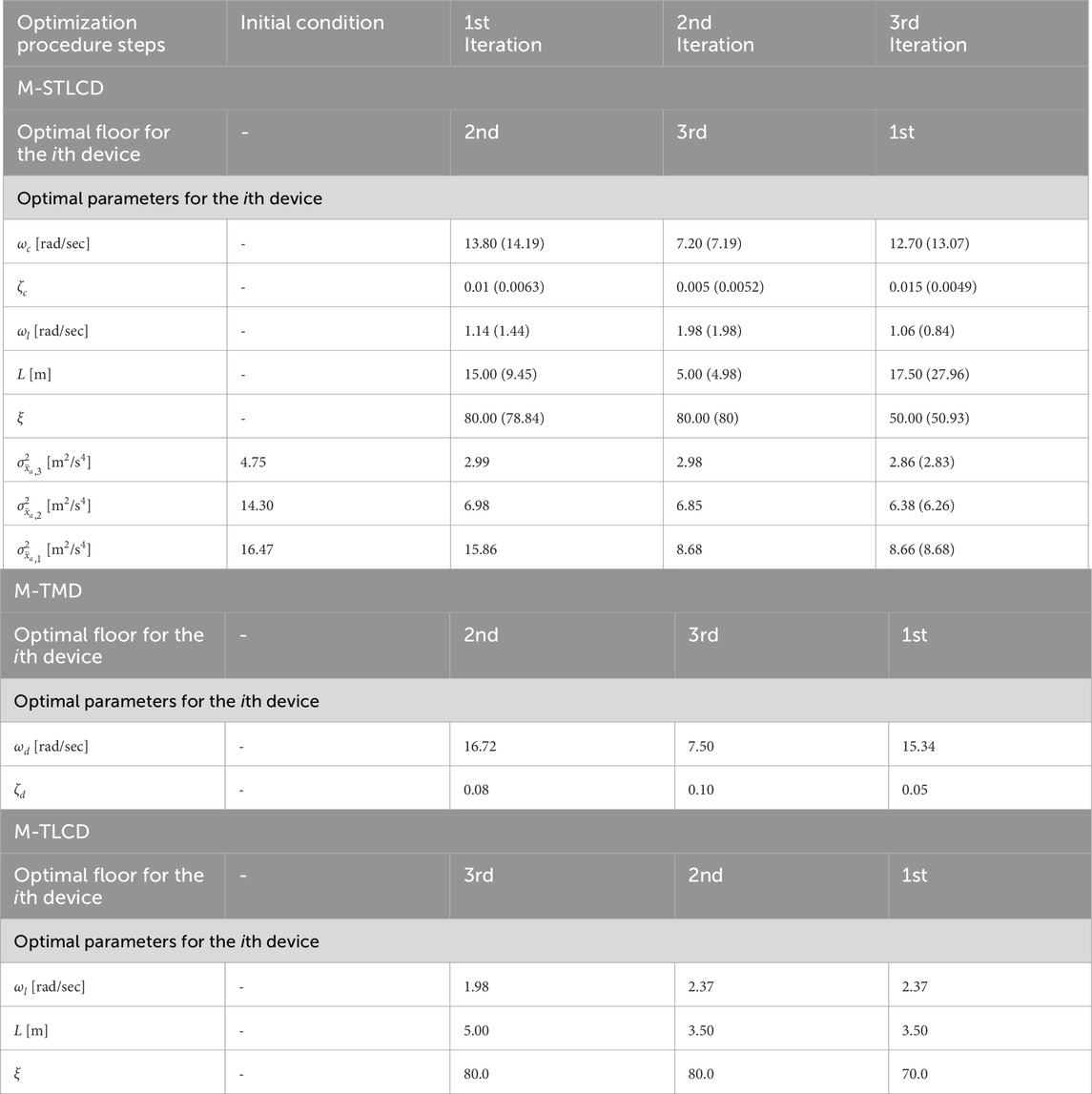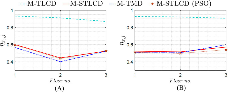 This Section reports the optimization results for the three-story structure previously introduced in Section 4. In particular, the results are provided in terms of optimized parameters, installation floors, and the vibration modes targeted by the optimization procedure for the M-STLCD-controlled three-story structure. An intuitive representation of the optimal installation floors is provided in Figure 5, while detailed results are listed in Table 2, which shows the outcomes of each iteration of the proposed procedure. For each entry, a comparison with the global PSO algorithm, implemented using the default MATLAB package, is included by reporting, in round parentheses next to the proposed values, the corresponding PSO results in terms of both device parameters and normalized variances obtained for the M-STCLD strategy. It is important to note that, unlike the sequential nature of the proposed approach, PSO results refer to the final configuration obtained by optimizing all devices simultaneously, rather than iteratively. As can be observed, the 1st STLCD unit is tuned to the 2nd mode from the very 1st iteration and placed on the 2nd floor. The tuning decision is likely influenced by the strong contribution of the 2nd mode, partly due to its low damping ratio, while the placement is driven by the largest component of the 2nd mode at the 2nd floor, making that level the most effective location for the 1st installations to achieve optimal control performance. At the 2nd iteration, the 2nd STLCD is installed on the 3rd floor and tuned to the 1st mode. In the 3rd and final iteration, the last device is placed on the 1st floor and tuned to the 2nd mode. As can be deduced from Table 2, although the parameters obtained via PSO differ significantly from those identified by the proposed sequential algorithm, the resulting acceleration variances are practically equivalent. At the upper two floors, the PSO approach achieves slightly lower variances, whereas at the 1st floor, the proposed method provides a marginally better reduction, highlighting how PSO’s effectiveness depends on careful tuning of internal parameters. Despite its simplicity, the proposed method delivers competitive, and sometimes superior, results without requiring extensive calibration. In any case, the maximum discrepancy is limited to 1.92% at the 2nd floor. This close agreement in performance confirms the effectiveness of the proposed sequential strategy, despite its simpler and more interpretable optimization process. The results for the other M-TMD and M-TLCD control strategies are also listed in Table 2. The M-TMD follows a similar trend to the M-STLCD. The M-TLCD, however, does not exhibit the same clear pattern of mode and floor selection, suggesting that its physically realizable lengths were insufficient to properly target the 2nd mode. This deviation, compared to the other devices, stems from constraints on the liquid length, imposed to ensure the practical feasibility of the M-TLCD, which shifts the liquid frequency either too far above or too far below the structural frequency. The effectiveness of these three strategies is compared in Figure 6, where the normalized variances of absolute acceleration and displacement are shown, respectively. Figure 6 illustrates the evolution of the normalized acceleration variance at each floor of the three-story structure throughout the optimization process. A clear trend of progressive variance reduction is observed for the M-STLCD, showing performance closely aligned with the M-TMD across all iterations. In contrast, the M-TLCD exhibits higher variance levels throughout the procedure, failing to match the effectiveness of the other strategies. Similarly, Figure 7 presents the evolution of the normalized displacement variance at each floor in the final configuration. For the M-STLCD, a comparison is included with results obtained via a global PSO to highlight the effect of simultaneous optimization across all devices through a metaheuristic approach. As shown in Figure 7A, in terms of acceleration variance, PSO exhibits essentially the same performance. On the other hand, regarding displacement response (Figure 7B), although it was not directly included in the objective function, the PSO algorithm yields slightly better results. This can be attributed to the global nature of the PSO strategy, which simultaneously adjusts all device parameters in a way that may indirectly favor improved displacement performance. Despite not being explicitly targeted, such outcomes suggest that the broader search space exploration characteristic of PSO may occasionally capture favorable trade-offs among multiple dynamic response quantities. Nonetheless, the proposed sequential discrete procedure yields comparable performance, especially in terms of acceleration reduction, as seen in Figure 7A, while offering significant advantages in terms of implementation simplicity and transparency of the optimization process. It is deterministic, less sensitive to algorithmic tuning, and requires substantially fewer resources. These characteristics make it particularly suitable for practical civil engineering applications, where robustness, reproducibility, feasibility, parameter traceability, step size control, and sequential installation might outweigh marginal performance gains. Again, the M-STLCD progressively reduces displacement variances at all floors with results comparable to the M-TMD. Figure 7 presents the final variance values across all floors in terms of normalized absolute accelerations (Figure 7A) and displacements (Figure 7B). In Figure 7A, the M-STLCD closely matches the M-TMD at the 3rd floor, while the M-TMD achieves slightly lower variances at the 1st and 2nd floors. In contrast, Figure 7B shows that the M-STLCD attains slightly lower displacement variance at the 3rd floor (∼0.57), and comparable performance across all levels. The M-TLCD, on the other hand, remains the least effective sol