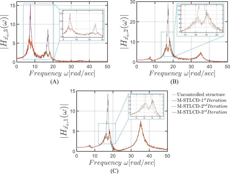 Figure 8. FRFs in terms of absolute accelerations at the: (A) 3rd; (B) 2nd; (C) 1st floor, for each iteration of the optimization procedure for the M-STLCD-controlled three-story structure.