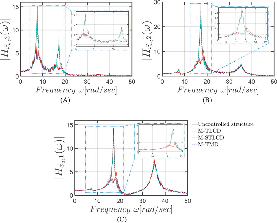 Figure 9. FRFs in terms of absolute accelerations in the final configuration at the: (A) 3rd; (B) 2nd; (C) 1st floor, of the three-story structure: M-STLCD vs. M-TMD and M-TLCD.