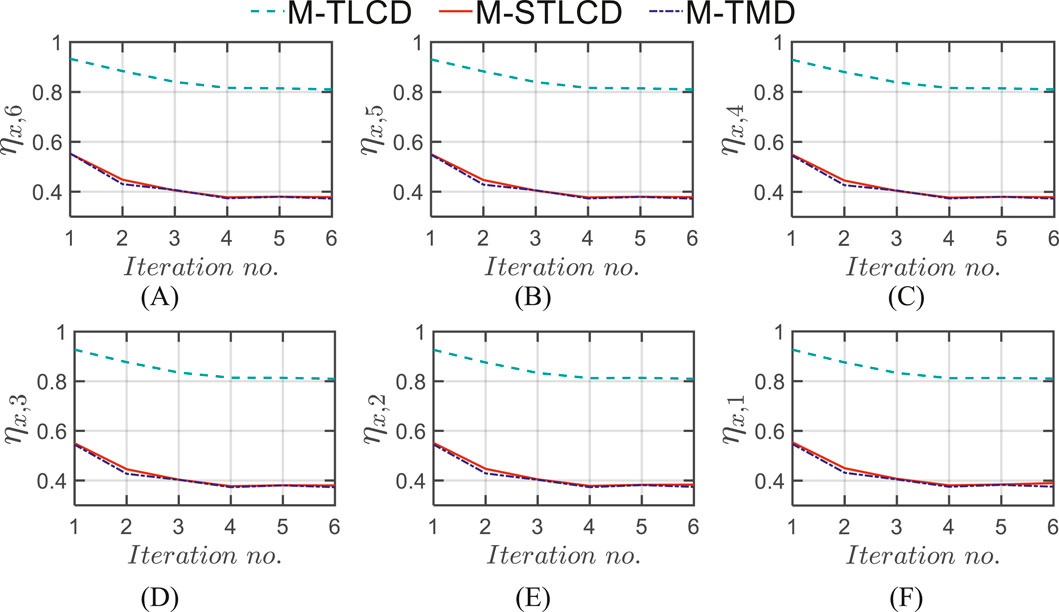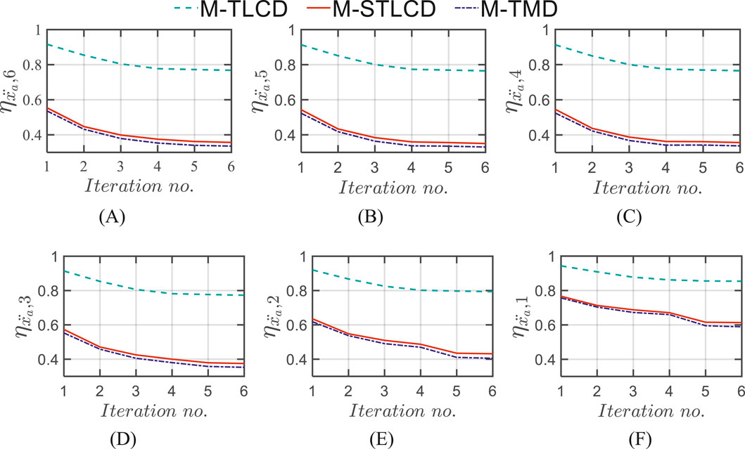Figure 10 depicts the results of the optimization procedure in terms of the installation floors for each iteration, while Table 3 presents the details of the results of the optimization procedures for the M-STLCD-controlled six-story structure. Unlike the three-story structure, each STLCD here is installed sequentially from the top to the bottom floor, almost always targeting the 1st structural mode and switching its tuning to the 2nd mode only at the 5th iteration as a consequence of the primary influence of the fundamental mode in early iterations. In contrast to the 3-DOF case, the acceleration variances obtained through the PSO algorithm are unexpectedly higher than those achieved by the proposed sequential method highlighting the sensitivity of global optimization algorithms to the choice of their internal parameters (such as population size, inertia weight, and acceleration coefficients) which, if not properly tuned, may lead to suboptimal results. These findings further reinforce the fact that, despite its simplicity and lack of global coordination, the proposed algorithm is capable of delivering competitive, and in some cases superior, performance without the need for extensive parameter calibration. As shown in Table 3, which also includes results for the M-TMD and M-TLCD, similar trends are observed for the M-TMD. In contrast, detecting the target mode is challenging for the M-TLCD, as the identified frequencies often deviate from the fundamental ones of the uncontrolled structure, underscoring its inadequacy for this type of short-period structure. Figure 11 illustrates the variation in normalized acceleration variance at each floor of the six-story structure over the course of the optimization process, comparing the performance of the M-STLCD, M-TLCD, and M-TMD. Overall, both the M-STLCD and the M-TMD achieve comparable reductions in variance, while the M-TLCD consistently underperforms. From the 6th down to the 3rd floor (Figures 11A–D), the M-STLCD and the M-TMD progressively reduce the structural response. A similar trend is observed at the lower levels (Figures 11E,F), where the steeper drop between the 4th and 5th iterations highlights the effectiveness of the 5th unit, installed on the second floor and tuned to the 2nd mode, in mitigating local accelerations. A similar trend is observed in terms of normalized displacement variance at all floors over the course of the optimization process (Figure 12), with the M-STLCD and M-TMD demonstrating comparable effectiveness, while the M-TLCD continues to show limited effectiveness in mitigating displacements. Figure 13A illustrates the final normalized variance in terms of absolute accelerations across all floors for each control strategy in the final configuration. As can be seen in Figure 13A, and as already evident from Table 3, in terms of normalized acceleration variance, PSO exhibits essentially the same performance, albeit slightly lower. While the M-TLCD remains the least effective, the M-STLCD shows progressive improvement, ultimately approaching the performance of the M-TMD at the upper floors. Notably, the M-TMD matches or even exceeds the performance of the M-STLCD in terms of normalized displacement variance at all levels (Figure 13B), while the M-TLCD proves to be the least effective. Again, as in the case of the three-story structure, the PSO algorithm yields slightly better results.