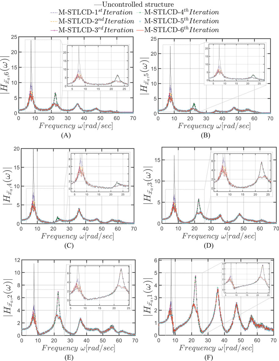 Figure 14. FRFs in terms of absolute accelerations for each iteration at the: (A) 6th; (B) 5th; (C) 4th; (D) 3rd; (E) 2nd; (F) 1st floor for each iteration of the optimization procedure for the M-STLCD-controlled six-story structure.